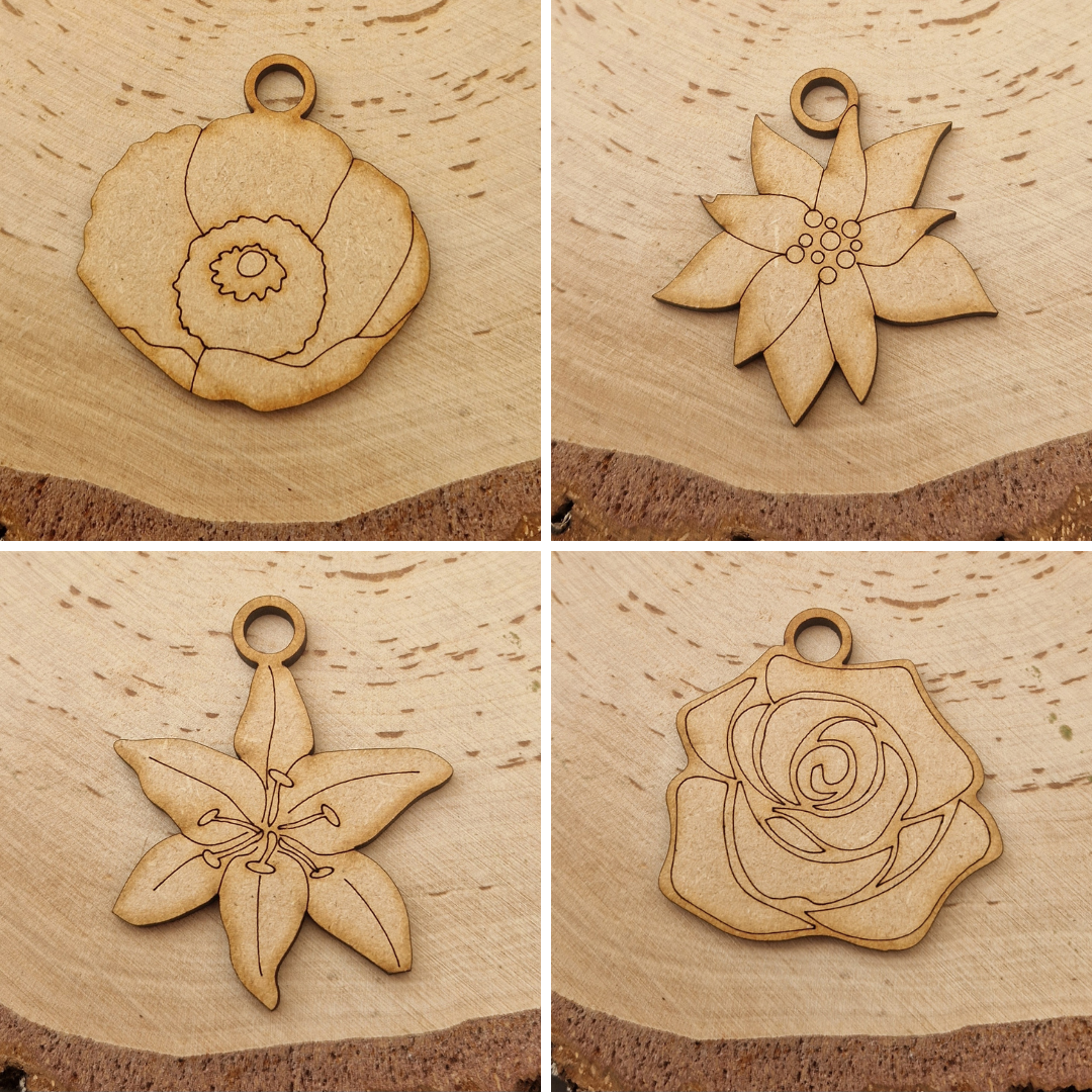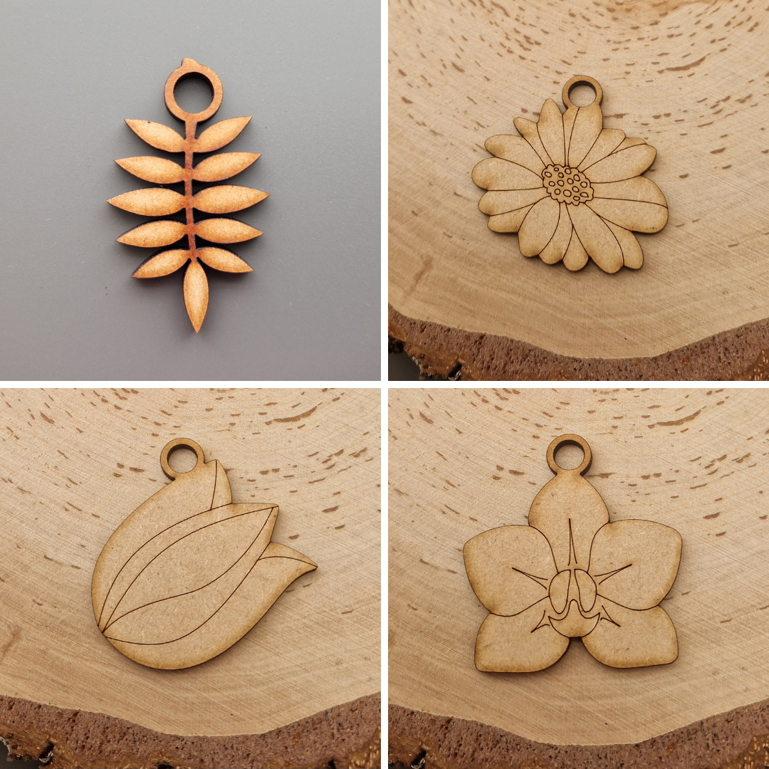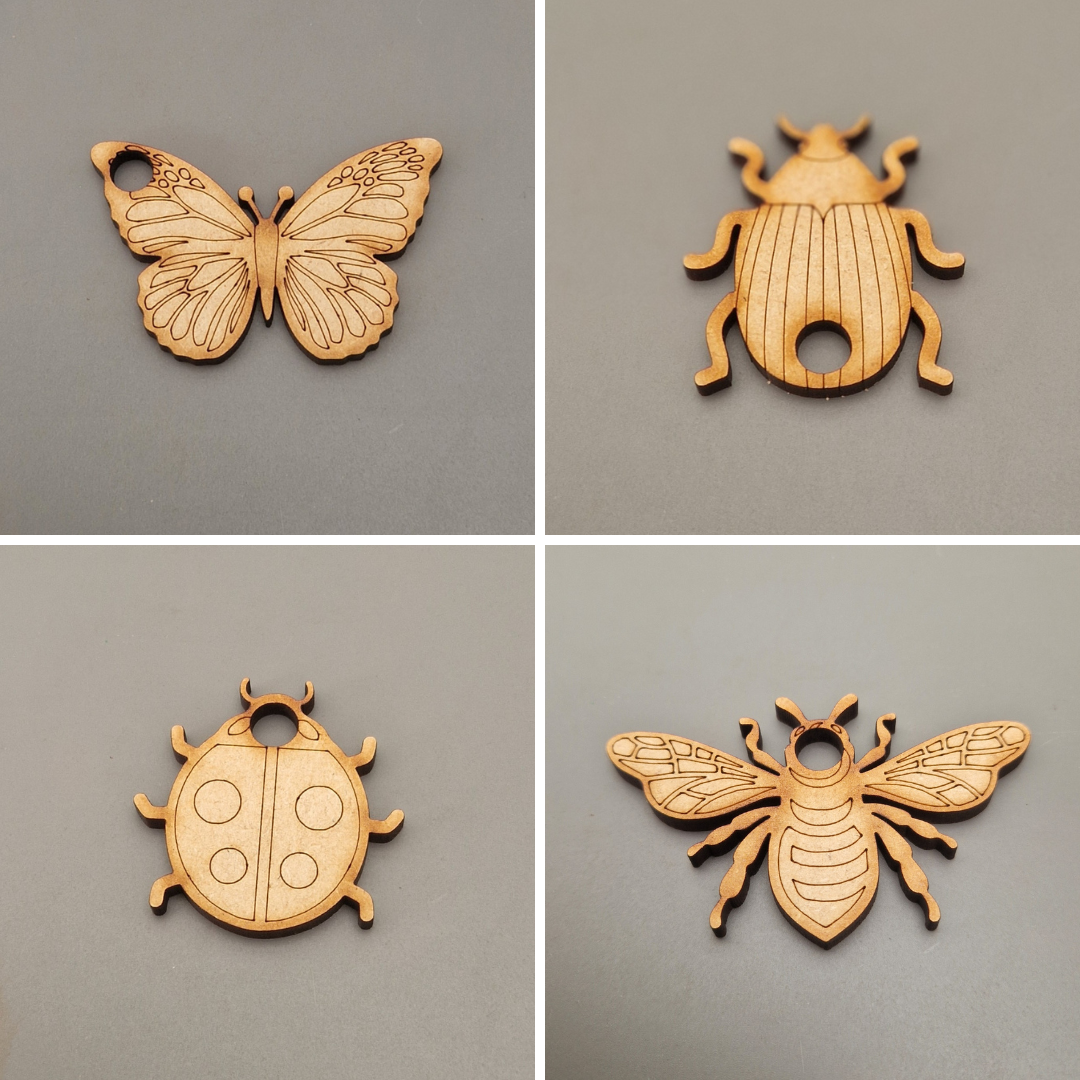 · 20 wooden shapes: moth, dragonfly, butterfly, bee, ladybird, beetle, lily, rose, daisy, poppy, tulip, orchid, jasmine, and 7 assorted leaves